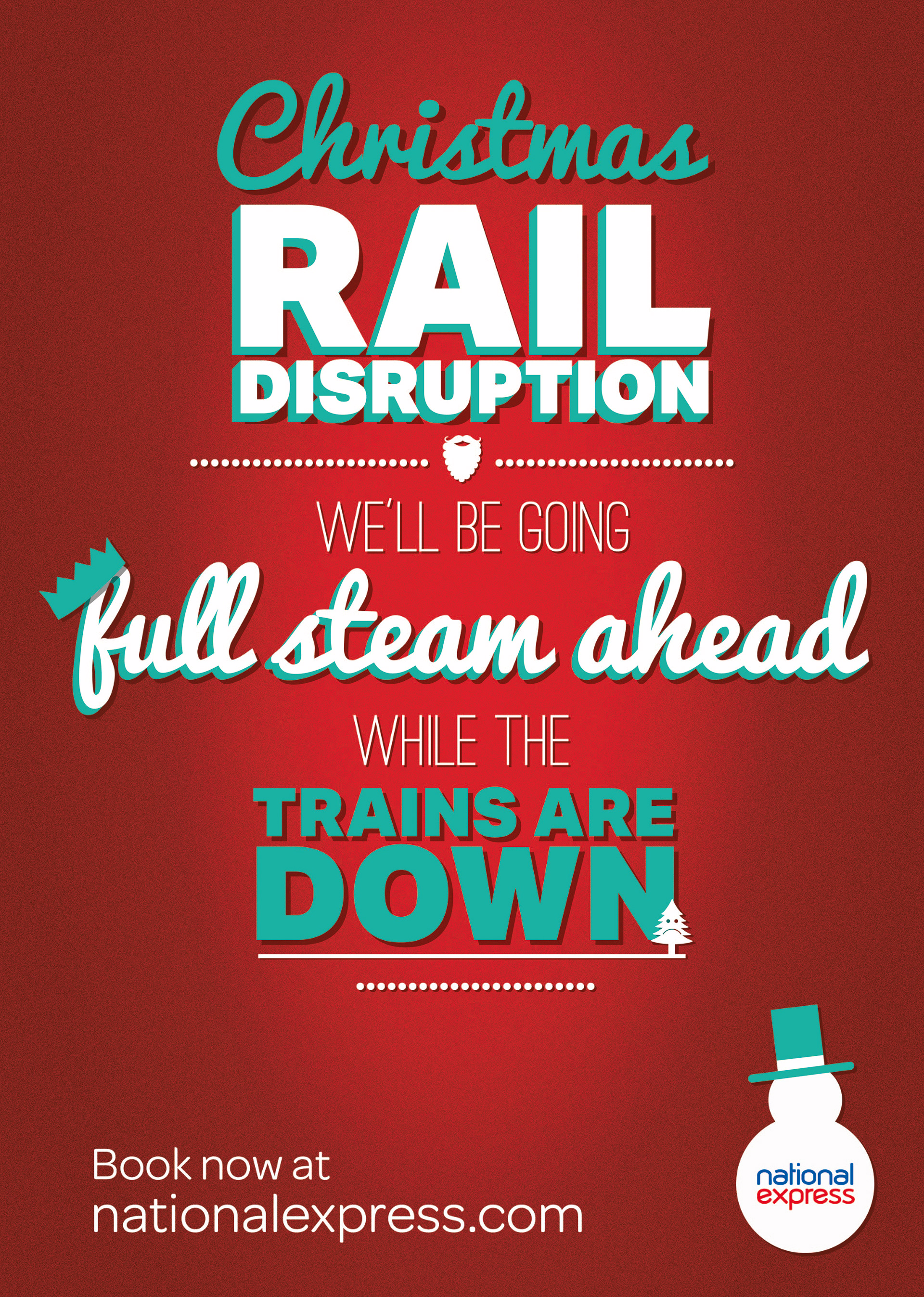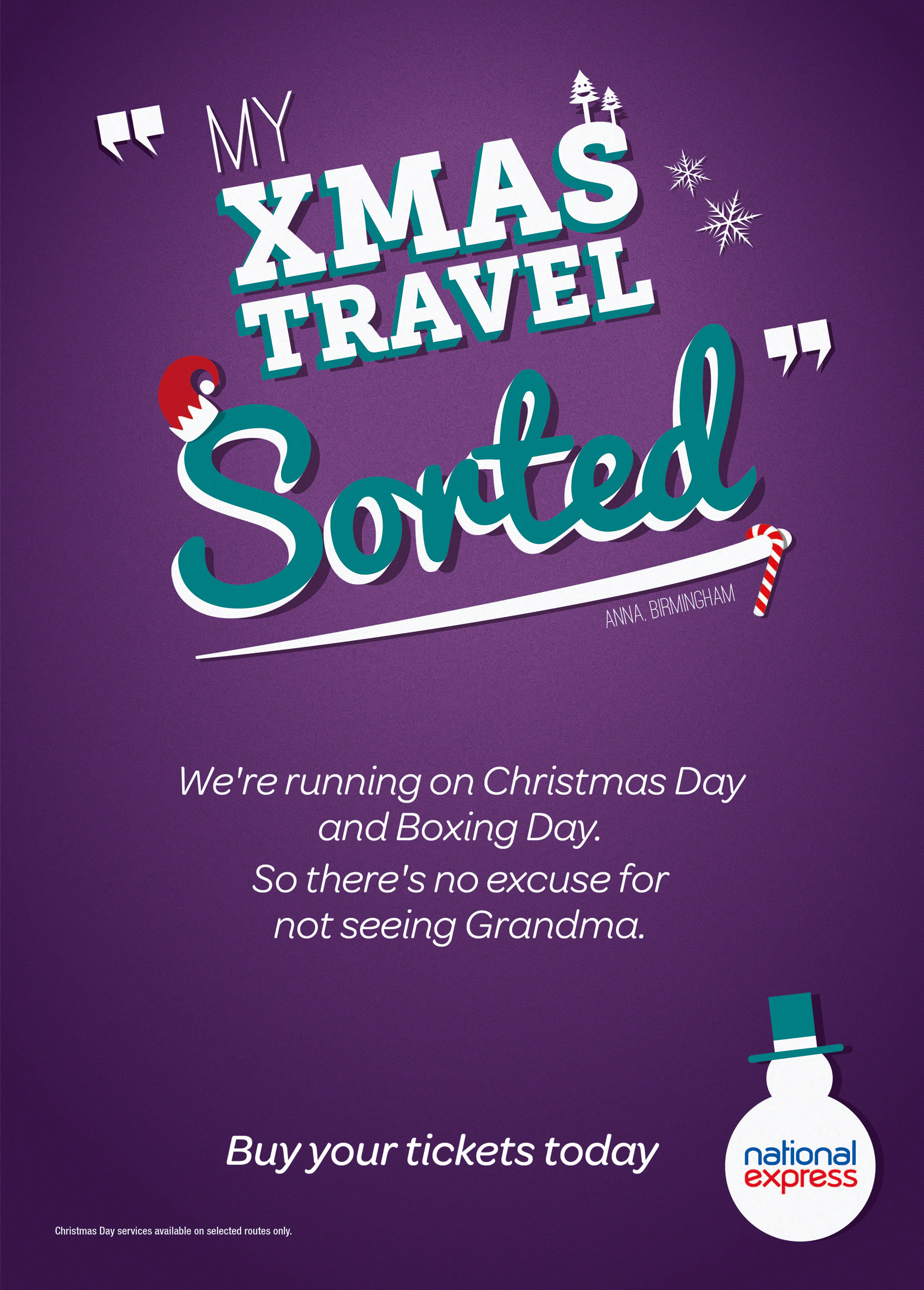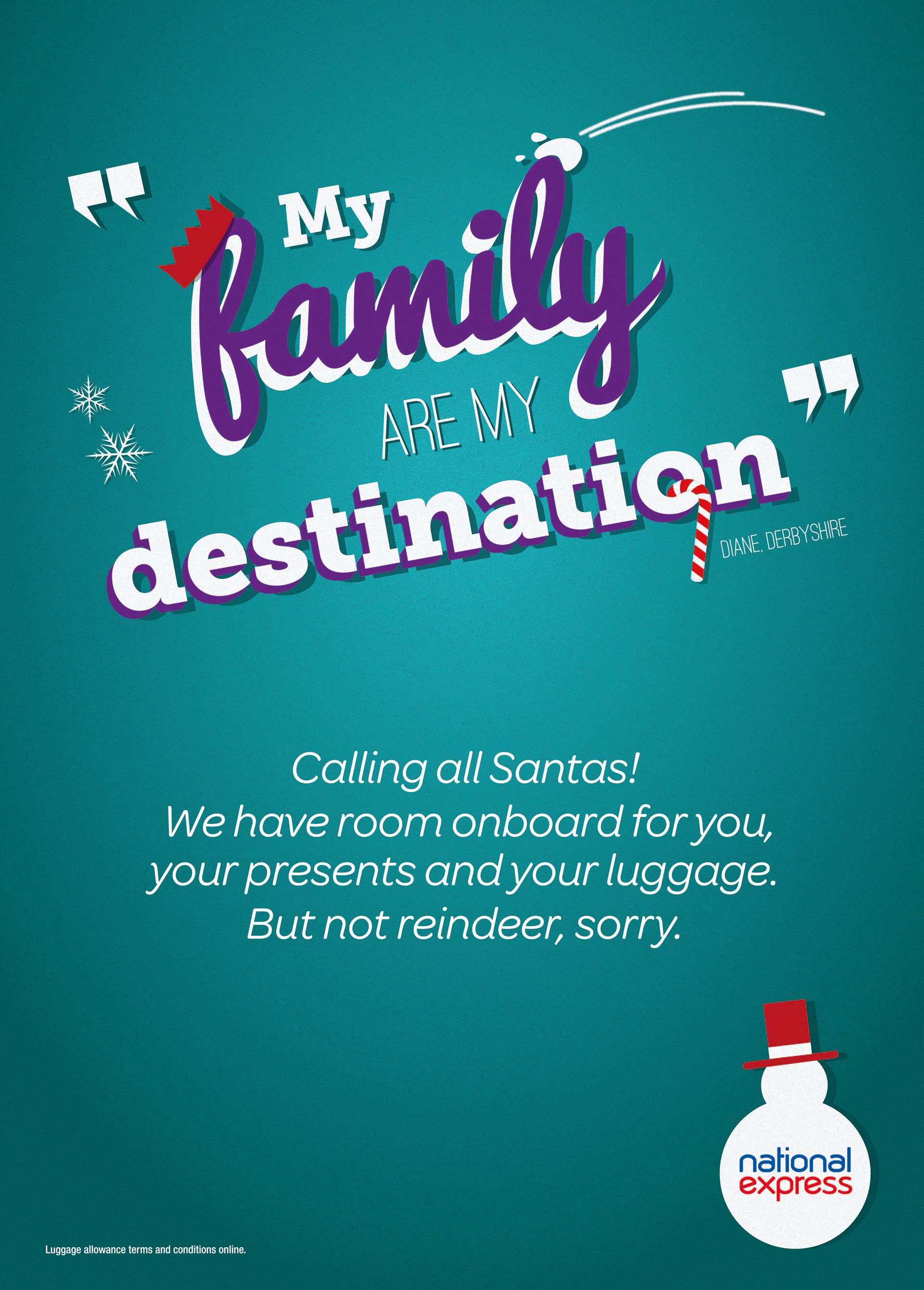 I was given full creative ownership of the 2014 Christmas campaign for National Express, including concept development, strategy, copy, illustration and artwork production. The campaign was built around genuine user-generated quotes from customers about their Christmas travel. To gather authentic material, I ran a small competition earlier in the year, which provided us with real stories to feature across the creative.